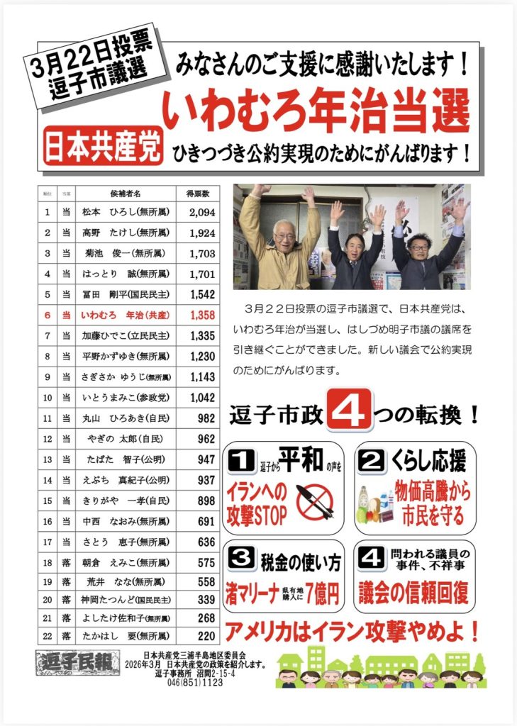 3月22日投票の逗子市議会議員選挙で、日本共産党のいわむろ年治氏が当選。はし…